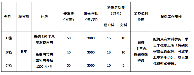 一、博士研究生招聘条件 1. 政治素质高,身心健康,具有较强的教学、科研能力; 2. 本科、硕士、博士阶段所学专业与所招聘的专业相同或相近; 3. 年龄在40岁以下; 4. 根据博士研究生所学专业及读博期间的业绩条件,分为三个档次: A档:被SCI二区收录论文1篇以上,或被SCI收录论文2篇以上,或在EI期刊发表论文4篇以上;国家级科研项目的主要完成者(导师排名第一,本人排名第二)。 B档:被SCI、EI期刊收录论文2篇以上。 C档:科研能力较强,满足学校招聘条件。 论文均限独著、第一作者或通讯作者,且为本专业学术论文;SCI分区以中国科学院文献情报中心发布的最新年度大类分区表为准。 二、博士研究生待遇 1. 待遇明细表