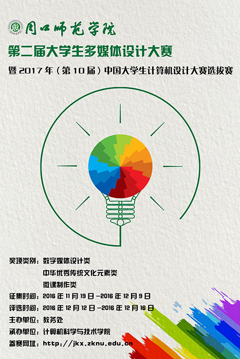 周口师范学院第二届大学生多媒体设计大赛 暨2017年(第10届)中国大学生计算机设计大赛选拔赛 为营造充满活力和健康向上的校园氛围,使大学生更好的了解计算机多媒体技术,同时丰富学生的校园生活,激发当代大学生的创造力和想象力,提高大学生的多媒体软件应用技能,挖掘校园网络人才,充分展示大学生精湛的技艺,特举办第二届大学生多媒体作品设计大赛。多媒体设计大赛旨在培养学生们对多媒体作品设计的兴趣,加强大学生创新创业教育。本次活动将为广大学生提供展现自己创意,发散自己思维的机会,丰富大家的课余生活。现将大赛的具体事项通知如下: 一、组织领导 主办单位:教务处 承办单位:计算机科学与技术学院 由主办单位和承办单位共同组成本次大赛的组委会。 二、参赛对象及形式 参赛对象:周口师范学院全日制本、专科在校大学生。 参赛形式:以团队形式(2-3位学生)设计参赛作品,不收取任何参赛费 三、参赛内容 第一类:数字媒体设计类 参赛主题:人与动物的和谐相处 (1)平面设计作品 平面设计作品使用Photoshop、CorelDraw等工具进行制作,要求设计完成2张海报,海报的尺寸规格为A4,分辨率为300dpi,并提交源文件和输出后的JPG格式文件。 (2)动画设计作品 动画设计作品使用Flash或3ds Max为主要创作工具,要求动画文件播放时间不超过5分钟,帧频24fp/s,Flash作品提交FLA格式和SWF格式文件,3ds Max作品提交MAX格式和MOV格式文件。 (3)影视设计作品 影视设计作品使用Adobe Premiere、Adobe After Effects、会声会影等工具进行制作,要求作品时间控制在8分钟之内,Adobe Premiere作品提交PRPROJ格式和FLV格式文件,Adobe After Effects作品提交AEP格式和FLV格式文件,会声会影作品提交VSP格式和FLV格式文件。 说明:主题所指的动物是指在动物分类学上存在的“动物”,是地球上目前存在的或曾经存在过动物,既不是外星生物,也不是龙、麒麟等神兽,或无细胞结构的生物。 第二类:中华优秀传统文化元素类 中华优秀传统文化元素类作品包括微电影、数字短片、计算机图形图像设计、计算机动画、交互媒体设计等小类,参赛主题如下: (1)自然遗产、文化遗产、名胜古迹 (2)歌颂打好河山的诗词散文 (3)优秀的传统道德风尚 (4)先秦主要哲学流派(道/儒/墨/法)与汉语言文学 (5)国画、汉字、汉字书法、年画、剪纸、音乐、戏剧、戏曲、曲艺 (6)民族建筑、民族服饰、民族手工、艺品 中华优秀传统文化元素类作品要求如下: (1)主题内容、情节均严格限在 1911 年前,人物、服饰、道具等应与作品主题、内容相符。 (2)自然遗产、文化遗产、名胜古迹若以微电影形式参赛应有人物、故事情节穿插,不能简单地拍成纪录片。 第三类:微课制作类 参赛主题: (1)计算机基础与应用类课程微课 (2)中、小学数学或自然科学课程微课 (3)汉语言文学(古汉语、唐诗宋词、散文等,内容限在 1911 年前)微课 (4)虚拟实验平台 微课设计作品采用录制电脑屏幕、用手机或摄像机拍摄等方式进行制作,使用CrazyTalk Animator、balabolka等工具制作微课素材,并使用Adobe Captivate工具对处理好的声音,视频、动画、场景等信息进行有效的整合。要求微视频中的背景简洁,图像清晰稳定,字幕简单明了,声音清楚,主要教学环节有字幕提示。具体技术要求:主流的MPEG、WMV、MP4、AVI、FLV、SWF等视频格式;屏幕宽度不低于600像素,不超过1024像素;文件大小不超过100M;播放时长不超过10分钟;视频前10秒左右,标注微课标题、参赛团队信息和所在学院。 四、作品要求 (1)作品要求是参赛团队的原创作品,严禁剽窃、抄袭,一经发现,将取消该作品的评选资格。 (2)作品内容健康、科学、向上,有时代气息,体现创新意识。 (3) 参赛作品必须包括作品相关文件(源文件、可执行文件)、报名表(见附件1)和参赛作品登记表(见附件2)。 (4)每位参赛团队不限制参赛的项目数,上交的作品若有多类的,做到一个文件夹一个作品。 (5)参赛作品不得含蓄意毁坏、恶意干扰、秘密截取或侵占任何系统、数据或个人资料的任何病毒、破坏程序、电脑蠕虫或定时程序炸弹等程序,否则将追究后果。 五、参赛进程 1.报名及作品提交 (1)报名 请填写附件中的报名表(见附件1)和参赛作品登记表(见附件2),保存电子版。 (2)作品提交 请于2016年12月9日之前将所填写的报名表和参赛作品登记表连同参赛作品一起压缩成RAR格式或者ZIP格式,命名为“作品类别_团队负责人学号+姓名_所在院系,将其上传到以下指定的位置。(联系人:张老师13526272318) 数字媒体设计类作品:上传到/html/20161112c2107a28307ftp:122.206.151.225.html/地址(账号:s_ww)的“数字媒体设计类作品”文件夹中。 中华优秀传统文化元素类设计作品:上传到ftp://122.206.151.225/地址(账号:s_ww)的“中华优秀传统文化元素类设计作品”文件夹中。 微课制作类作品:上传到ftp://122.206.151.225/地址(账号:s_ww)的“微课设计类作品”文件夹中。 2.结果公布 2016年12月16日:在计算机科学与技术学院网页上公布获奖学生名单及等级,颁奖日期另行通知。 教务处 计算机科学与技术学院 2016年11月8日