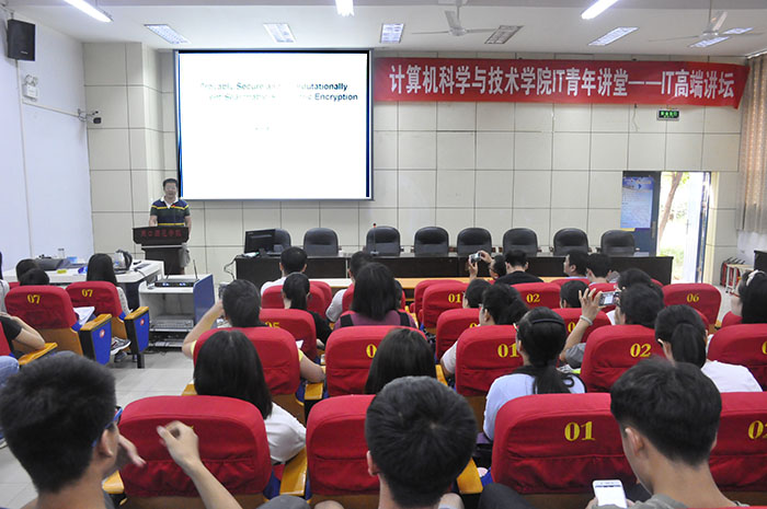 6月7日下午,美国密西根州立大学博士生导师刘向阳教授应邀到我校进行学术交流。 首先,刘向阳教授就“如何进行人才培养、如何做好科研”与教师代表进行座谈。座谈会上,刘教授结合自身丰富的科研、教学经验,提出了很多针对性和建设性的意见和建议。紧接着,刘向阳教授在第三报告厅做了题为《Provably Secure and Computationally Efficient Searchable Symmetric Encryption》的学术报告。计算机科学与技术学院李亚院长、周文刚书记及200多名师生聆听了报告会,报告会由计算机科学与技术学院董仕博士主持。报告中,刘向阳教授以云存储在应用中的隐私保护问题为研究背景,重点讲解了多用户场景下如何解决云数据存储中的隐私保护问题和IND-CKA安全模型,最后用实验数据验证了模型在强隐私保护下可以实现实时的Range query。在报告会讨论环节,刘向阳教授针对教师和学生提出的问题一一做了详细的解答,并对隐私保护、数据安全等方面给出了宝贵的建议。刘教授的精彩演讲引起了在座师生的浓厚兴趣,使师生切实感受了在互联网高速发展的今天网络安全的重要性和必要性,引起很大的共鸣,纷纷表示受益匪浅。 刘向阳,男,美国密西根州立大学和南京大学计算机科学与技术系教授、博导,长江学者,主要从事网络与安全研究工作。曾获美国国家自然科学基金颁发的杰出青年教授奖,美国电气和电子工程师协会(IEEE)和国际信息处理联合会(IFIP)联合颁发的 William C. Carter奖。承担六项美国国家自然科学基金项目;担任国际顶级期刊ACM/IEEE Transactions on Networking (ToN)编委,国际SCI期刊COMCOM专题主编;获得五项关于防火墙的美国专利;出版两本关于防火墙的英文学术专著;在ACM/IEEE Transactions等著名SCI期刊上已发表论文三十余篇,多篇论文已经被美国一流大学的研究生课程所选用。