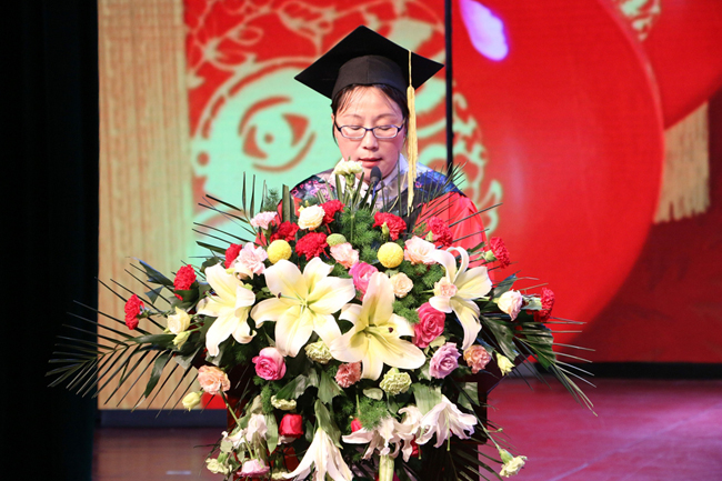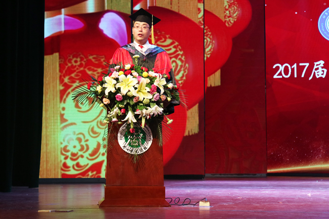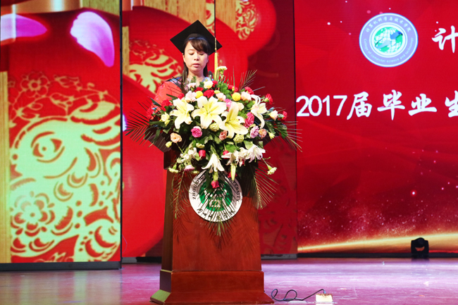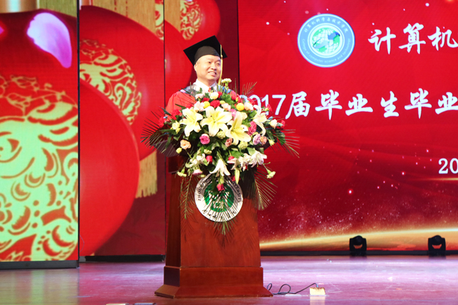 院长李亚教授对同学们在校期间勤奋学习、刻苦努力所取得的成绩给予了高度肯定,并对毕业生步入社会后的表现提出要求,寄予厚望。副院长彭海云宣读《优秀毕业生表彰决定》、《优秀学士学位论文表彰决定》及《毕业生毕业及学士学位授予情况说明》。计算机学院2017届本科毕业生251人,专科毕业生101人,经学校学术委员会研究,决定授予我院祝志敏、陈静静等238名同学工学学士学位。其中吕亚洁等10名同学获得省级优秀毕业生荣誉,毛东康等24名同学获得校级优秀毕业生荣誉,祝志敏等5名同学的毕业论文获得2017届本科优秀学士学位论文。教师代表李靖回忆了与毕业生朝夕相处的四年时光。一年春去秋又来,二渡红尘漫飞扬,三月桃花红酥手,四年一瞬太匆匆。回忆的同时也寄予毕业生们美好的期望以及向他们的人生态度提出了更高的要求。学生代表陈静静在发言中总结了自己的大学生活,说出了同学们的心声,表达了对计算机学院这个大家庭的留恋,对兢兢业业辛苦工作老师的感谢,对朝夕相处同学的祝福。发言完毕后,她带领全体毕业生进行毕业宣誓。各位毕业生导师为获得学士学位的毕业生颁发证书,拨苏正冠。