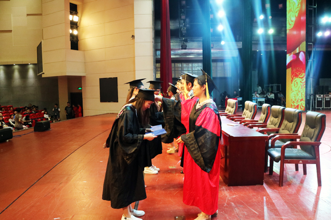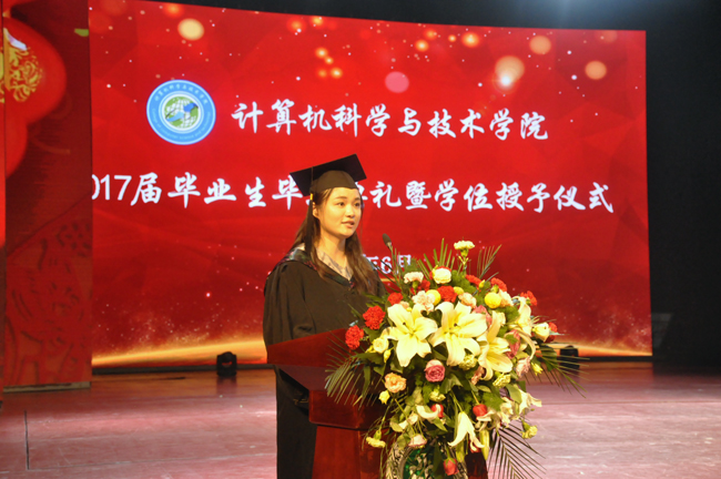 院长李亚教授对同学们在校期间勤奋学习、刻苦努力所取得的成绩给予了高度肯定,并对毕业生步入社会后的表现提出要求,寄予厚望。副院长彭海云宣读《优秀毕业生表彰决定》、《优秀学士学位论文表彰决定》及《毕业生毕业及学士学位授予情况说明》。计算机学院2017届本科毕业生251人,专科毕业生101人,经学校学术委员会研究,决定授予我院祝志敏、陈静静等238名同学工学学士学位。其中吕亚洁等10名同学获得省级优秀毕业生荣誉,毛东康等24名同学获得校级优秀毕业生荣誉,祝志敏等5名同学的毕业论文获得2017届本科优秀学士学位论文。教师代表李靖回忆了与毕业生朝夕相处的四年时光。一年春去秋又来,二渡红尘漫飞扬,三月桃花红酥手,四年一瞬太匆匆。回忆的同时也寄予毕业生们美好的期望以及向他们的人生态度提出了更高的要求。学生代表陈静静在发言中总结了自己的大学生活,说出了同学们的心声,表达了对计算机学院这个大家庭的留恋,对兢兢业业辛苦工作老师的感谢,对朝夕相处同学的祝福。发言完毕后,她带领全体毕业生进行毕业宣誓。各位毕业生导师为获得学士学位的毕业生颁发证书,拨苏正冠。