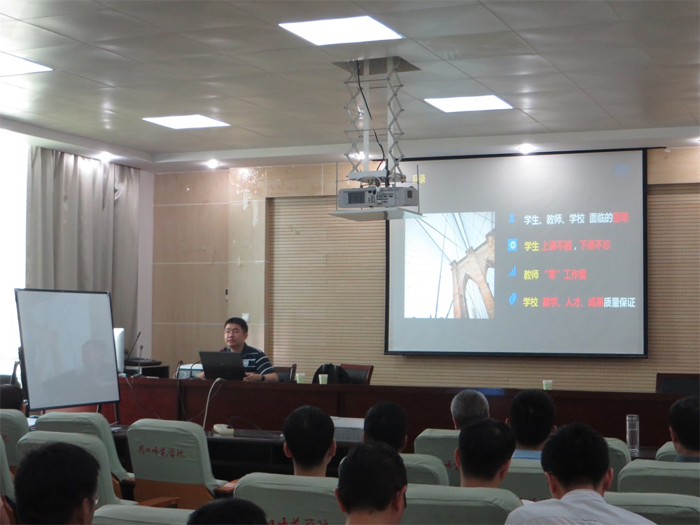 为深化教育教学改革,探索学习新的教学方法和手段,提高人才培养质量,2017年7月4日下午,计算机学院请首都经贸大学刘经纬博士在综合楼4楼会议室举办了“实境编程”技术讲座,学院全体教师参加了此次讲座。 刘博士深入分析了高校计算机教学,特别是编程类课程教学中学生、教师及学校各方面的困惑及存在的问题,进而引入“实境编程”技术。实境编程教学产品基于创新的可编辑的双向代码互动轻视频技术开发,以解决编程教学目前存在的理论与实践脱节,编程实践缺失,编程能力难以评价等问题,提高教师的教学效率,对于培养学生的编程思维、提高计算机编程教学的能力、推动计算机教学模式创新有着重要的作用。