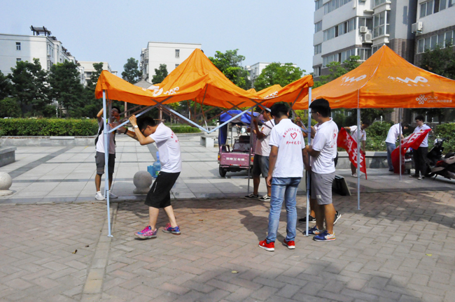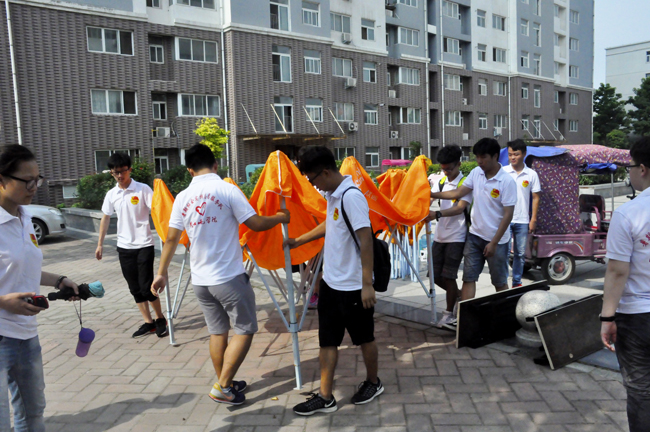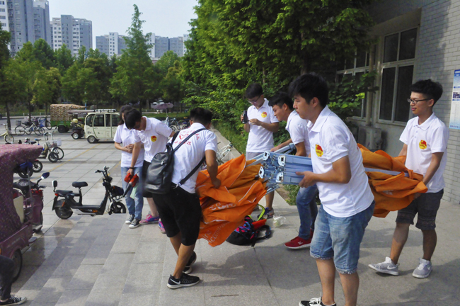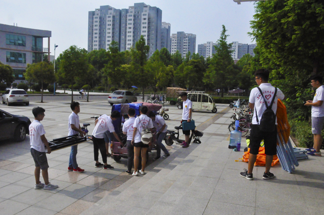 迎着似火的骄阳,志愿者们积极地将活动所需的帐篷、桌凳和一些维修工具搬上车。此时,志愿者们额头流下的汗珠映着阳光仿佛一个个跳动着的精灵,象征着志愿者们辛勤劳动的荣耀”勋章“。